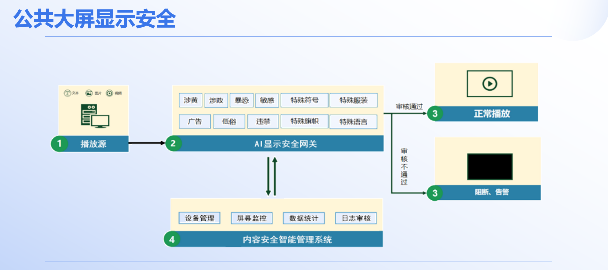 本方案基于AI显示安全网关,对输入的视频、图片、文本内容进行实时分析。依托预训练的多标签识别模型,精准识别违禁、涉敏、广告等风险内容,实现播放中审核与违规实时阻断。确保公共大屏内容安全、合规
